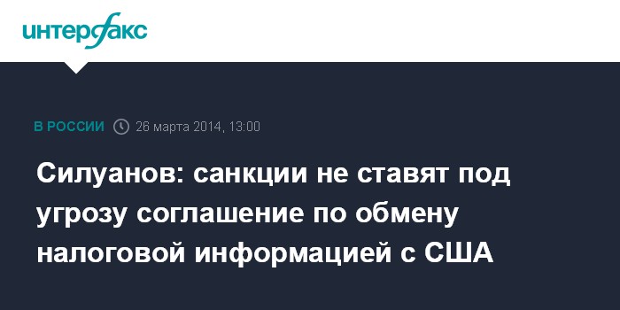 Москва. 26 марта. INTERFAX.RU - Планы по подписанию соглашения между Россией и США о взаимном обмене информацией в рамках действия закона FATCA остаются в силе, несмотря на введение санкций США в отношении ряда граждан и АБ "Россия", сообщил министр финансов РФ Антон Силуанов журналистам.