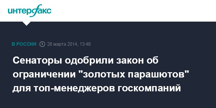 Москва. 26 марта. INTERFAX.RU - Совет Федерации на заседании в среду одобрил закон, ограничивающий трехкратным размером зарплаты выходные пособия при увольнении топ-менеджерам госкомпаний, госкорпораций, государственных внебюджетных фондов, ГУПов и МУПов.