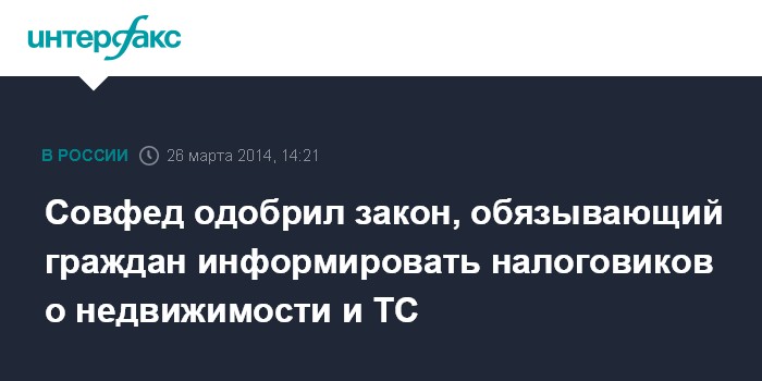 Москва. 26 марта. INTERFAX.RU - Совет Федерации одобрил закон, обязывающий граждан информировать налоговые органы о наличии у них недвижимого имущества и транспортных средств, признаваемых объектами налогообложения, если они не получают уведомления об уплате соответствующего налога.