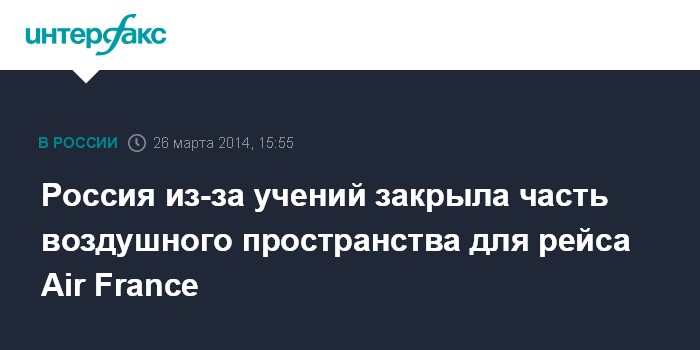 Москва. 26 марта. INTERFAX.RU - Самолет авиакомпании Air France был вынужден изменить свой курс после того, как Россия неожиданно объявила о закрытии части своего воздушного пространства в связи с военными учениям, сообщает агентство Associated Press со ссылкой на информацию, распространенную авиаперевозчиком.