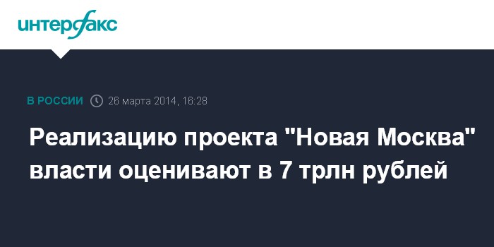 Москва. 26 марта. INTERFAX.RU - Общая сумма затрат на реализацию проекта "Новая Москва" составит около 7 трлн рублей, заявил руководитель столичного департамента развития новых территорий Владимир Жидкин.