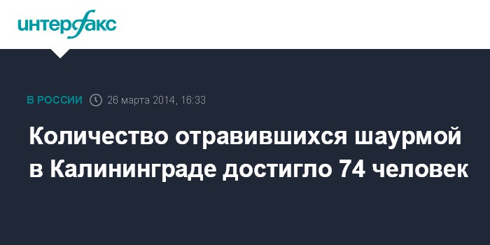 Москва. 26 марта. INTERFAX.RU - Число обратившихся за медицинской помощью в Калининграде после употребления шаурмы в одном из заведений города достигло 74 человек, сообщает региональное управление Роспотребнадзора.