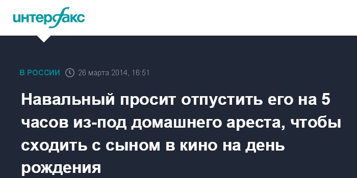 Москва. 26 марта. INTERFAX.RU - Находящийся под домашним арестом оппозиционер Алексей Навальный просит следователя отпустить его в кинотеатр с сыном в день рождения ребенка.