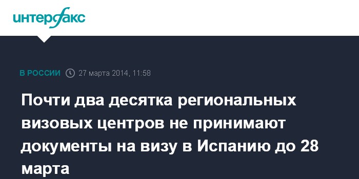 Москва. 27 марта. INTERFAX.RU - Документы на визу в Испанию не принимают до 28 марта 17 региональных визовых центров VFS Global, сообщается на официальном сайте компании.