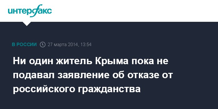 "Население Крыма с момента присоединения к Российской Федерации становятся гражданами РФ, если не заявят в течение месяца о том, что они остаются гражданами Украины либо лицами без гражданства. На сегодняшний момент таких заявлений не поступало", - сказал один из руководителей ФМС РФ в эфире телеканала "Россия 24".