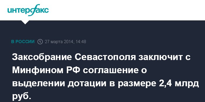 Москва. 27 марта. INTERFAX.RU - Депутаты Заксобрания Севастополя в четверг приняли решение о заключении с Минфином РФ соглашения "О предоставлении бюджету города Севастополя дополнительной финансовой помощи из федерального бюджета в виде дотации на поддержку мер по обеспечению сбалансированности бюджетов субъектов РФ".