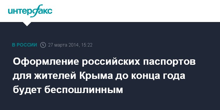 Москва. 27 марта. INTERFAX.RU - Госпошлина за оформление российского паспорта не будет взиматься с жителей Крыма до конца года, заявили в Федеральной миграционной службе.