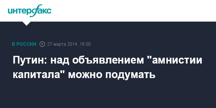 Ново-Огарево. 27 марта. INTERFAX.RU - Президент РФ Владимир Путин считает, что над объявлением "амнистии капитала" можно подумать, но спешить не надо.