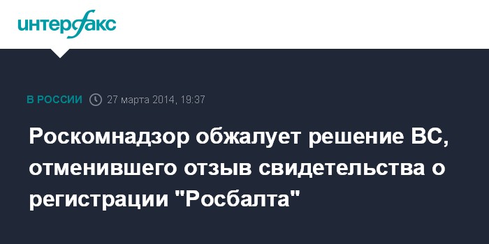 Роскомнадзор обжалует решение ВС, отменившего отзыв свидетельства о регистрации "Росбалта"