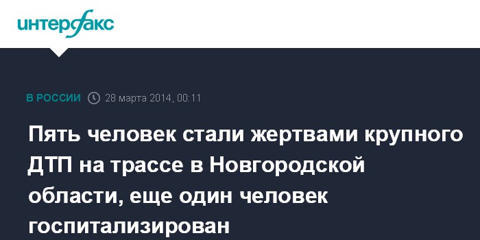 Москва. 28 марта. INTERFAX.RU - Пять человек погибли и один пострадал в крупном ДТП на трассе в Новгородской области, сообщили "Интерфаксу" в МЧС России.