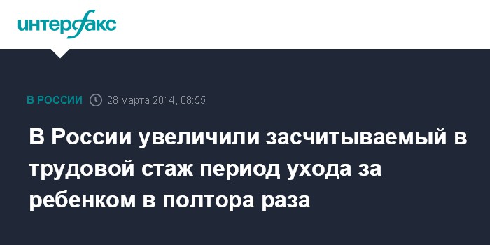 "Федеральным законом от 28 декабря 2013 года N427-ФЗ "О внесении изменений в статью 11 федерального закона "О трудовых пенсиях в Российской Федерации" и статью 1 федерального закона "О средствах федерального бюджета, выделяемых Пенсионному фонду Российской Федерации на возмещение расходов по выплате страховой части трудовой пенсии по старости, трудовой пенсии по инвалидности и трудовой пенсии по случаю потери кормильца отдельным категориям граждан" увеличен период, засчитываемый в страховой стаж в связи с уходом одного из родителей за детьми до достижения ими возраста полутора лет, до четырех с половиной лет в общей сложности (ранее - до трех лет) ", - говорится в сообщении, опубликованном на официальном сайте правительства в пятницу.