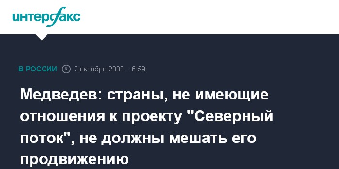 Москва. 2 октября. INTERFAX.RU - Президент России Дмитрий Медведев заявил, что страны, которые не имеют отношения к проекту "Северный поток", не должны мешать его развитию.