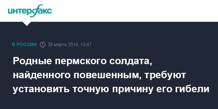 Москва. 28 марта. INTERFAX.RU - Информация о возможном самоубийстве юноши из Пермского края, который был отправлен проходить срочную службу в воинскую часть в Мурманской области, поступила в совет краевого отделения Комитета солдатских матерей России.