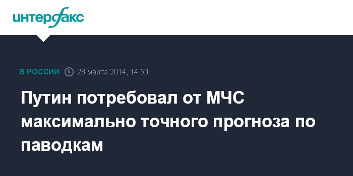 Москва. 28 марта. INTERFAX.RU - Президент РФ Владимир Путин ждет от МЧС максимально точного прогноза паводковой ситуации в 2014 году и рассчитывает на готовность личного состава к чрезвычайным ситуациям.