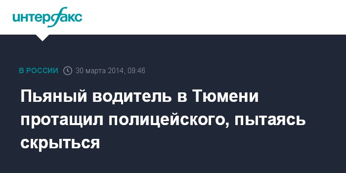 Москва. 30 марта. INTERFAX.RU - Нетрезвый водитель в Тюмени протащил сотрудника полиции на капоте своей машины во время задержания, сообщили "Интерфаксу" в пресс-центре МВД России в воскресенье.