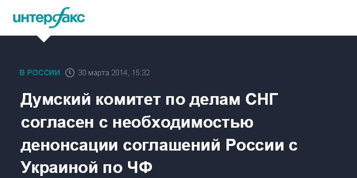 Москва. 30 марта. INTERFAX.RU - Профильный комитет Госдумы рекомендовал в понедельник рассмотреть вопрос о денонсации российско-украинских соглашений по Черноморскому флоту. "Решение было принято единогласно всеми членами комитета - мы выносим проект закона на Совет Думы в понедельник и будем просить палату рассмотреть его в этот же день на дополнительном вечернем пленарном заседании", - сообщил журналистам в воскресенье глава комитета по делам СНГ, евразийской интеграции и связям с соотечественниками Леонид Слуцкий.