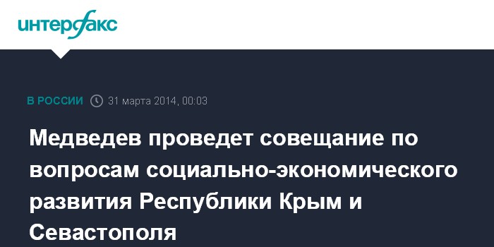 Москва. 31 марта. INTERFAX.RU - Премьер-министр РФ Дмитрий Медведев проведет в понедельник совещание, на котором будут обсуждаться актуальные вопросы социально-экономического развития Республики Крым и Севастополя, а также реализация поручений по итогам совещания у председателя правительства 24 марта этого года.
