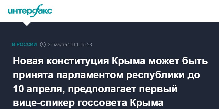 Новая конституция Крыма может быть принята парламентом республики до 10 апреля, предполагает первый вице-спикер госсовета Крыма