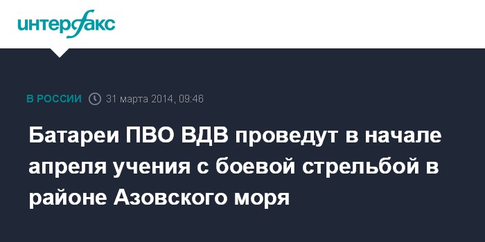 Москва. 31 марта. INTERFAX.RU - Подразделения противовоздушной обороны Воздушно-десантных войск проведут тактические учения с боевой стрельбой в районе Ейска, сообщил "Интерфаксу-АВН" официальный представитель управления пресс-службы и информации Минобороны России по ВДВ полковник Евгений Мешков.
