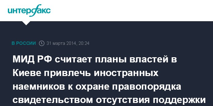 Москва. 31 марта. INTERFAX.RU - МИД РФ считает, что появившаяся в СМИ информация о планах привлечения нынешней украинской властью сотрудников иностранных частных военных компаний для "обеспечения правопорядка" может свидетельствовать о стремлении киевского режима к подавлению гражданского протеста и недовольства.