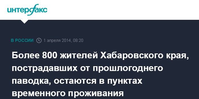 Москва. 1 апреля. INTERFAX.RU - В Хабаровском крае продолжают действовать 19 пунктов временного проживания (ПВП) для пострадавших от прошлогоднего наводнения жителей, в них до сих пор остаются 843 человека, сообщил зампред правительства края по вопросам социального развития Владимир Чаюк.