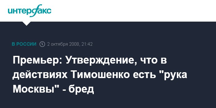 Москва. 2 октября. INTERFAX.RU - Премьер-министр России Владимир Путин назвал бредовыми утверждения СМИ о том, что за действиями премьер-министра Украины Юлии Тимошенко есть "рука Москвы".