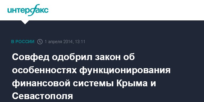 Москва. 1 апреля. INTERFAX.RU - Совет Федерации на внеочередном заседании во вторник одобрил закон "Об особенностях функционирования финансовой системы Республики Крым и города федерального значения Севастополя на переходный период".