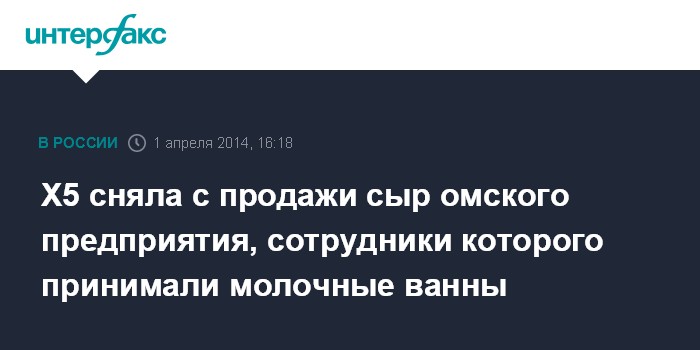 Москва. 1 апреля. INTERFAX.RU - Х5 Retail Group, управляющая сетями "Пятерочка", "Перекресток", "Карусель", сняла с продажи сыр "Чечил" омского предприятия "Торговый дом "Сыры", сотрудники которого были уличены в том, что принимали ванны в молочной продукции на производстве, сообщается в пресс-релизе ритейлера.