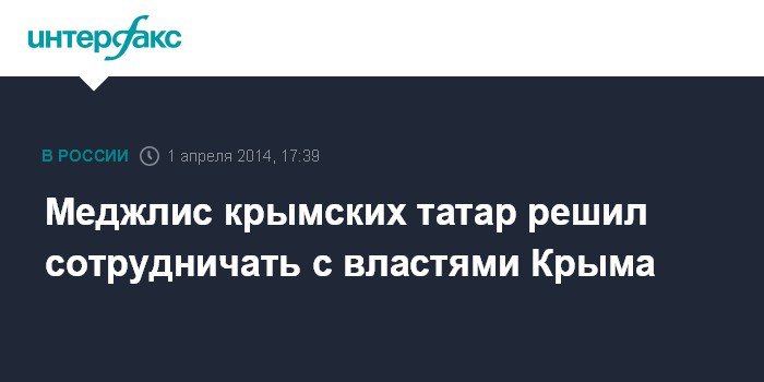 Москва. 1 апреля. INTERFAX.RU - Меджлис - общественный представительный орган крымских татар - на заседании во вторник принял решение о сотрудничестве с властями Крыма, сообщает агентство "Крыминформ".