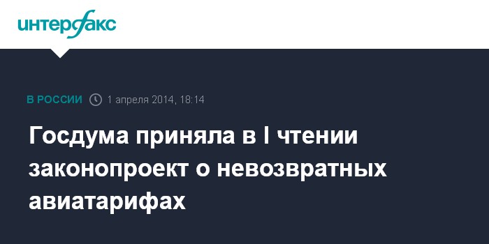 Москва. 1 апреля. INTERFAX.RU - Госдума РФ на пленарном заседании во вторник приняла в первом чтении законопроект, позволяющий российским авиакомпаниям применять невозвратные авиатарифы.