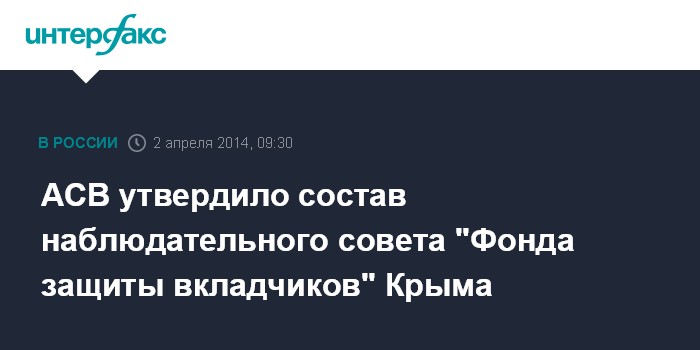 Москва. 2 апреля. INTERFAX.RU - Совет директоров государственной корпорации "Агентство по страхованию вкладов" (АСВ) на заседании 1 апреля утвердил устав и состав наблюдательного совета "Фонда защиты вкладчиков" Крыма, говорится в пресс-релизе АСВ.