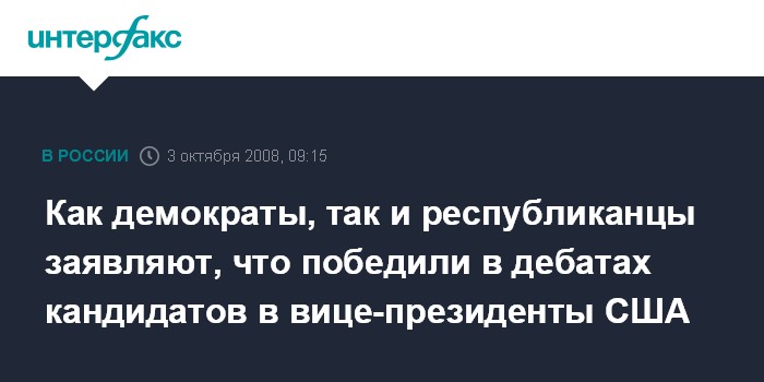 Москва. 3 октября. INTERFAX.RU - Представители демократов и республиканцев объявили о победе своих кандидатов в вице-президенты США на состоявшихся в городе Сент-Луисе дебатах.