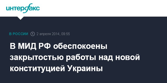 Москва. 2 апреля. INTERFAX.RU - В МИД РФ с настороженностью отмечают, что работа над реформированием украинской конституции идет в закрытом режиме, без освещения в СМИ и взаимодействия с общественностью.