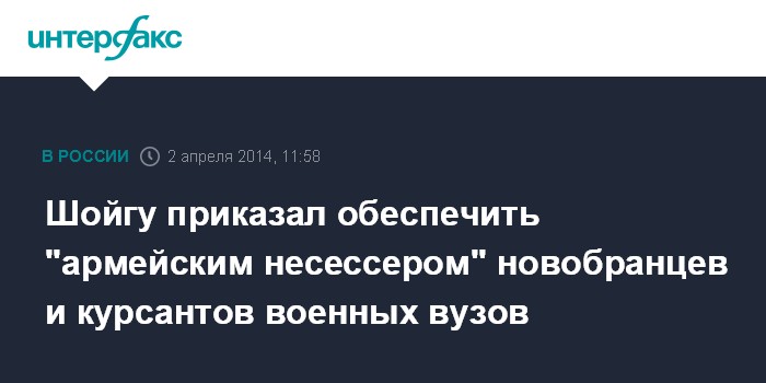 "Начиная с весенней призывной кампании 2014 года каждый призывник будет обеспечиваться "армейским несессером". Он будет выдаваться каждому призывнику в военном комиссариате вместе с вещевым имуществом. Также согласно приказу министра обороны данная норма распространяется на курсантов вузов Минобороны России", - сказано в сообщении управления пресс-службы и информации военного ведомства, поступившем в "Интерфакс-АВН" в среду.