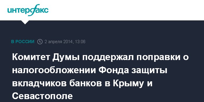 Москва. 2 апреля. INTERFAX.RU - Комитет Госдумы по бюджету и налогам на заседании в среду рекомендовал нижней палате парламента принять в первом чтении и в целом законопроект об особенностях налогообложения Фонда защиты вкладчиков банков в Крыму и Севастополе.