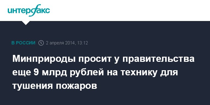 Москва. 2 апреля. INTERFAX.RU - Минприроды просит правительство РФ дополнительно выделить 9 млрд рублей в течение трех лет для покупки спецтехники для тушения пожаров, сообщил министр природных ресурсов и экологии РФ Сергей Донской на селекторном совещании у председателя правительства Дмитрия Медведева по вопросу о подготовке к паводковому и пожароопасному сезону 2014 года.
