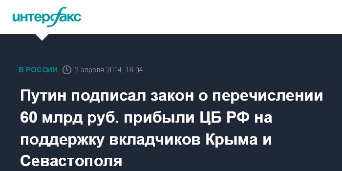 Путин подписал закон о перечислении 60 млрд руб. прибыли ЦБ РФ на поддержку вкладчиков Крыма и Севастополя