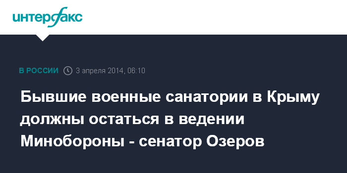 Москва. 3 апреля. INTERFAX.RU - Ведомственные военные санатории и базы отдыха в Крыму должны оставаться в введении Министерства обороны РФ, считает председатель Комитета по обороне и безопасности Совета Федерации Виктор Озеров.
