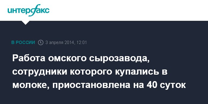Москва. 3 апреля. INTERFAX.RU - Центральный районный суд Омска вынес постановление о временном приостановлении работы ООО "Торговый дом "Сыры", сотрудники которого искупались в технологической емкости с молоком, до устранения нарушений, сообщила представитель регионального управления Роспотребнадзора Галина Гладких.