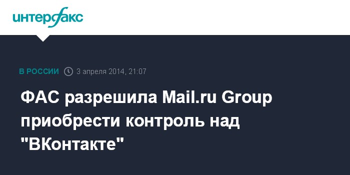 Москва. 3 апреля. INTERFAX.RU - Федеральная антимонопольная служба (ФАС) опубликовала положительное решение по ходатайству Mail.ru Group Ltd. о "приобретении прав, позволяющих определять условия осуществления предпринимательской деятельности ООО "В контакте".