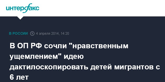 Москва. 4 апреля. INTERFAX.RU - В Общественной палате РФ (ОП РФ) считают, что идея снимать отпечатки пальцев у детей мигрантов с 6 лет выглядит как "нравственное ущемление".