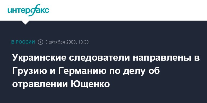 Москва. 3 октября. INTERFAX.RU - Генеральная прокуратура Украины направила следователей в Грузию и Германию для проведения следственных действий, чтобы выйти на возбуждение уголовного дела относительно определенного физического лица в расследовании дела об отравлении президента Виктора Ющенко, заявил генеральный прокурор Украины Александр Медведько на встрече с В.Ющенко в пятницу, отвечая на вопрос президента о ходе расследования дела относительно его отравления, сообщает пресс-служба главы государства.