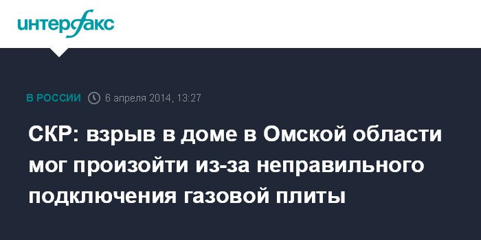 Москва. 6 апреля. INTERFAX.RU - Одна из версий взрыва газа в Омской области - самовольное подключение плиты. "Проверяется версия о возможном самовольном подключении газовой плиты одним из жильцов. Рассматриваются и другие версии случившегося", - говорится в сообщении, размещенном в воскресенье на сайте СУ СКР по Омской области.