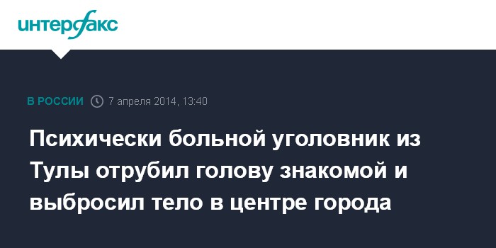 Москва. 7 апреля. INTERFAX.RU - Ранее привлекавшийся к уголовной ответственности за убийство и признанный невменяемым житель Тулы задержан по подозрению в жестоком убийстве молодой женщины, обезглавленный труп которой был найден в одном из дворов в центральной части города.