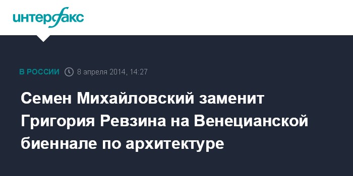 Накануне архитектурный критик, журналист Григорий Ревзин сообщил на своей странице в Facebook, что приказом министра культуры РФ Владимира Мединского он уволен с поста комиссара Российского павильона на Венецианской биеннале по архитектуре. "Только что позвонили из Министерства культуры и сообщили, что утром министр Мединский своим личным решением уволил меня с поста комиссара Российского павильона на Венецианской биеннале по архитектуре", - написал Ревзин.