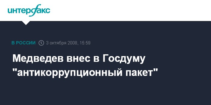 Москва. 3 октября. INTERFAX.RU - Президент России Дмитрий Медведев внес в Госдуму "антикоррупционный пакет", сообщили "Интерфаксу" в аппарате нижней палаты парламента.