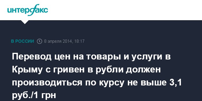 Перевод цен на товары и услуги в Крыму с гривен в рубли должен производиться по курсу не выше 3,1 руб./1 грн
