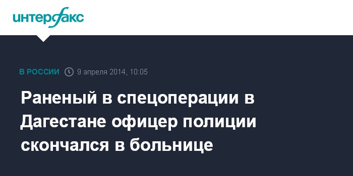 Москва. 9 апреля. INTERFAX.RU - Один из трех полицейских, попавших во вторник под обстрел во время спецоперации в Дагестане, скончался от полученных ранений, сообщил агентству "Интерфаксу" источник в правоохранительных органах.