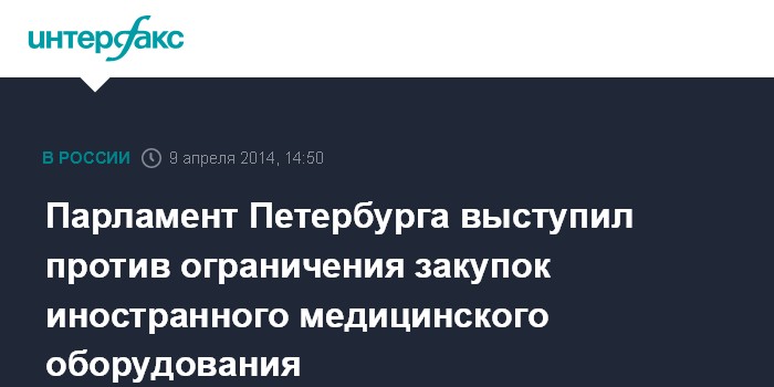 Санкт-Петербург. 9 апреля. INTERFAX.RU - Депутаты Санкт-Петербурга в среду обратились к министру промышленности и торговли РФ Денису Мантурову с просьбой не ограничивать закупки высокотехнологичного иностранного медицинского оборудования.