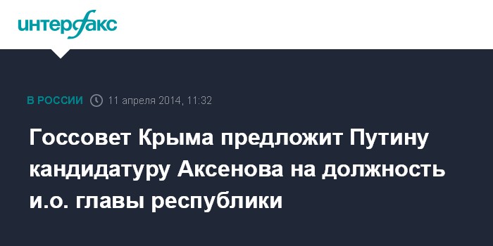 Москва. 11 апреля. INTERFAX.RU - Государственный совет Крыма предложит президенту России Владимиру Путину кандидатуру председателя Совета министров Крыма Сергея Аксенова на должность исполняющего обязанности главы республики, сообщил спикер Госсовета Владимир Константинов.